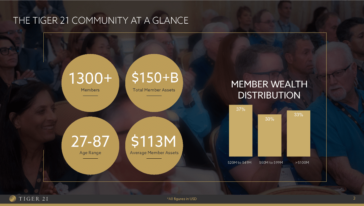 TIGER 21 Members (The Investment Group Enhanced Returns) are part of a trusted, confidential community that enables ultra-high-net-worth entrepreneurs, investors and executives to learn from each other to navigate the issues and opportunities that stem from success.