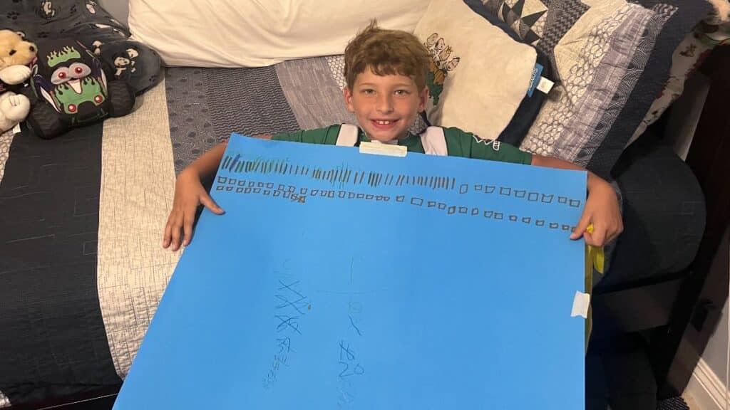 Although I like dogs, we don’t have one right now. That may be changing soon though since my 8 ½ year old son Chase is a dog LOVER! He stops and asks anyone we see while walking if he can pet their dog and falls in love with any dog he spends time with. This is him peeking over his “Dog Responsibility Chart.” He’s been asking for a dog for quite some time. We said that once he earned 50 points (1 point for walking a friend or neighbor’s dog; 1 point for picking up poop), we would have a serious discussion about getting a dog. He made it to 50 points (and even donated a few points so his sister could get to 50 as well). First time in history that kids were excited when a dog pooped twice on one walk!